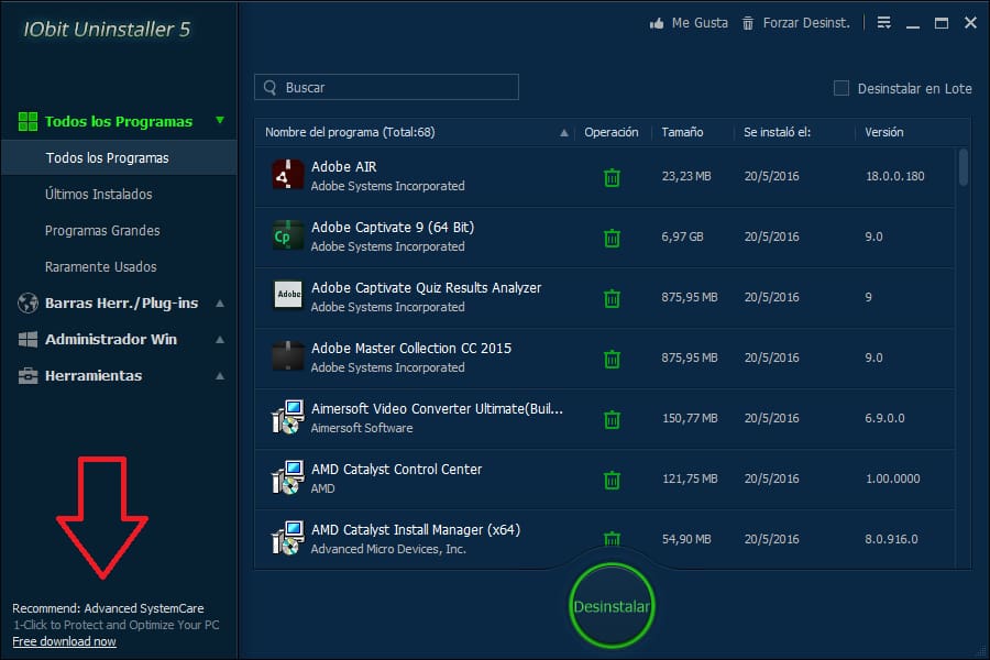 Si por accidente instalaste al complemento adicional que viene junto con «IObit Uninstaller» (Advanced SustemCare), puedes usar la característica de la herramienta que estamos recomendando en el presente artículo para quitarla de tu sistema operativo.